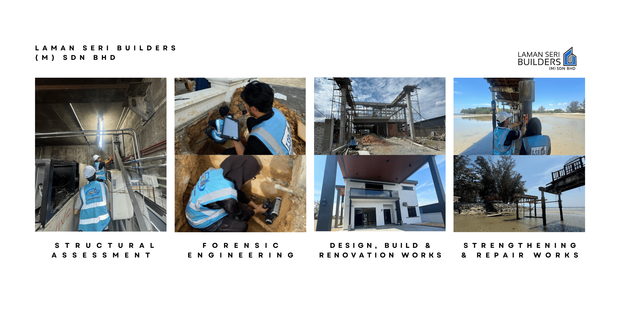 Laman Seri Builders (M) Sdn Bhd is a civil and structural engineering specialist in Malaysia, providing integrated services in structural assessment, forensic engineering, testing (NDT & DT), engineering design, and structural strengthening for buildings and infrastructure.